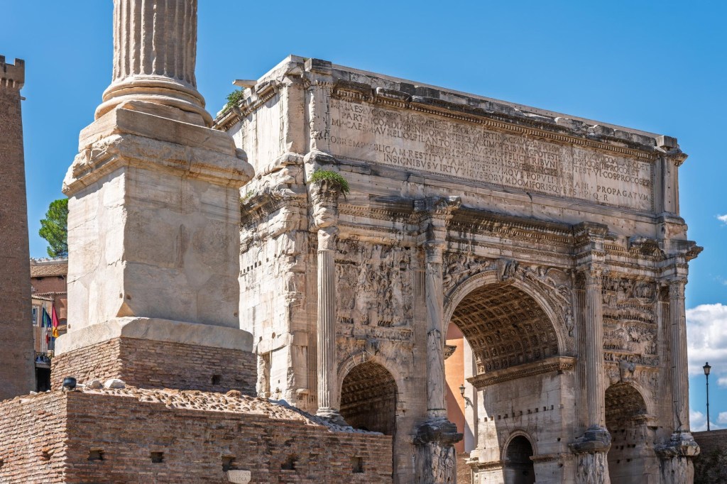 Located in the Roman Forum, this triumphal arch celebrates victories over the Parthians. The reliefs are more crowded and less illusionistic than earlier High Empire works — figures stack upward rather than recede naturally. Hierarchy and clarity matter more than realism.